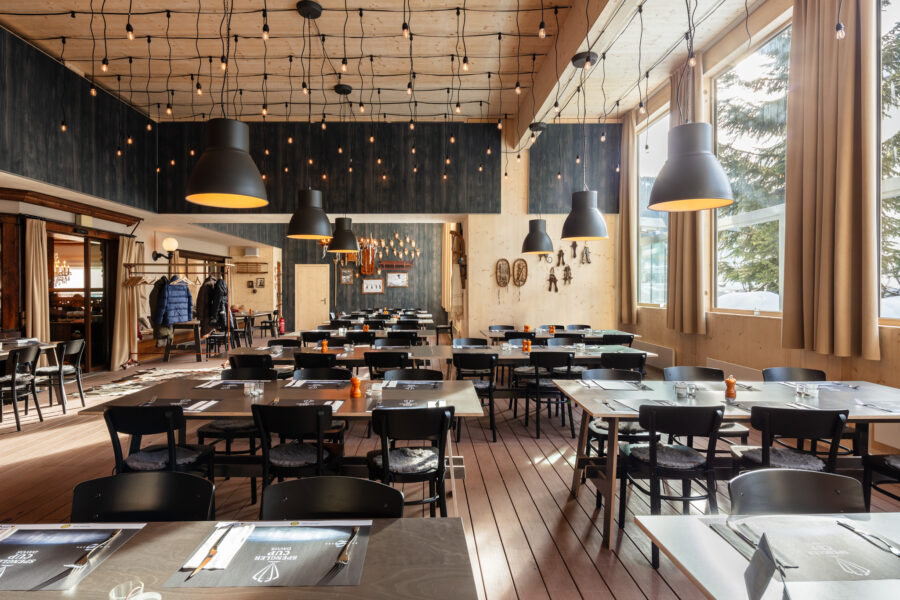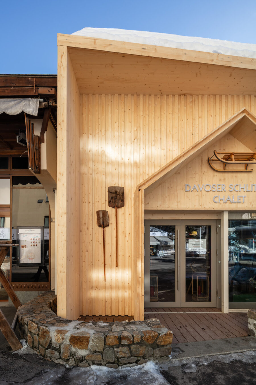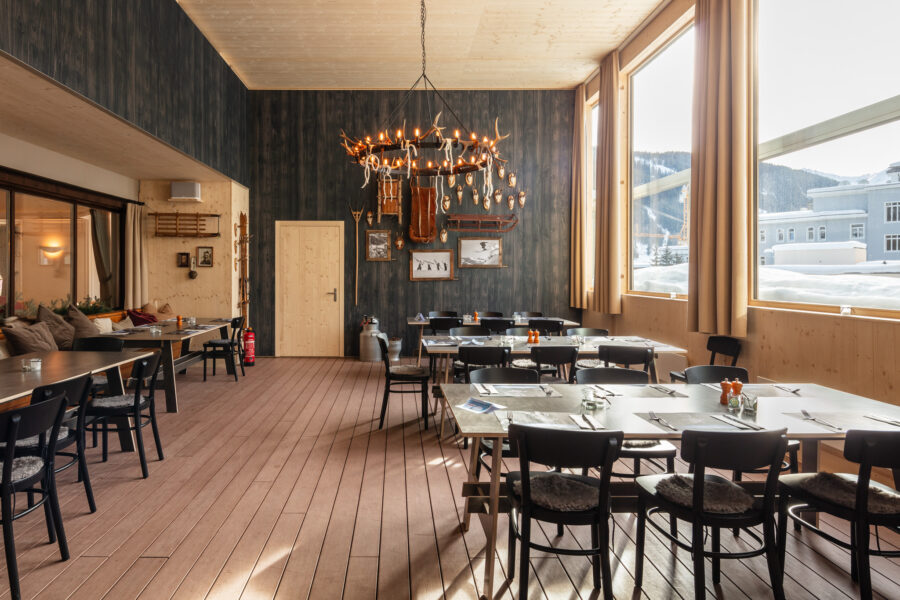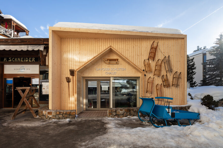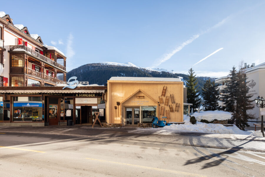 Bei diesem Temporärbau an der Promenade durften wir die Architektur und Realisation übernehmen. Bereits Ende November wurde das Chalet aufgestellt und bleibt noch bis Ostern in Betrieb. Der Temporärbau, der auch während des WEF-Jahrestreffens genutzt wurde, steht auf der Terrasse des Restaurants Schneider’s und wurde um die bestehende Metallkonstruktion herum aufgebaut. Von dieser merkt man im Innern nichts mehr. Durch das Material Holz entsteht eine gemütliche Atmosphäre, in welcher über die Wintermonate feinste Fondue-Spezialitäten genossen werden können.