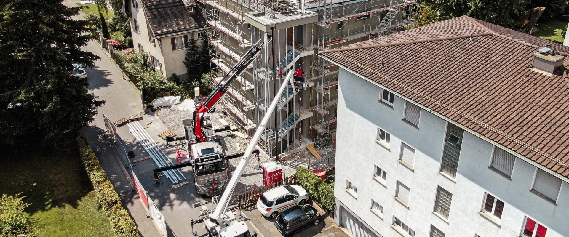 Rückblick auf die Montage des aussenliegenden Treppenhauses an der Nordstrasse in Chur. Die Baustelle ist weitgehend abgeschlossen – im Austausch mit den Eigentümern erfolgen nun noch die letzten Umgebungsarbeiten. Hier geht’s zu den Video-Aufnahmen. 17.10.2024